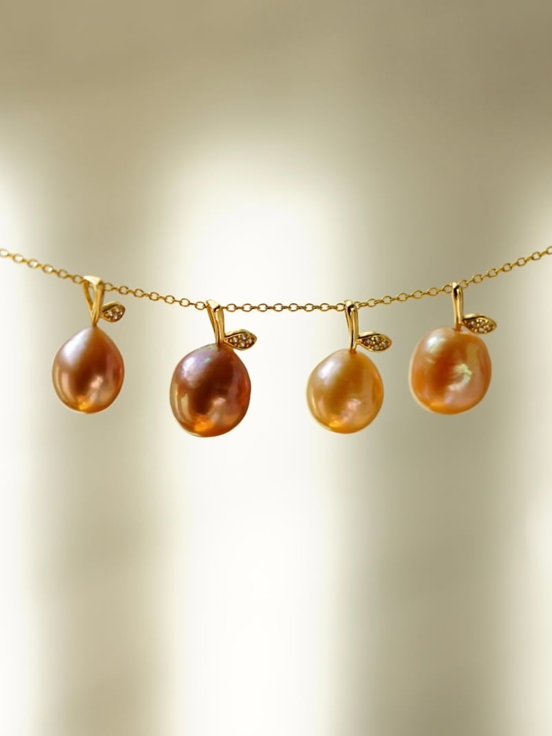 カラフルでいびつなバロックパールが、フルーツのペンダントトップに。